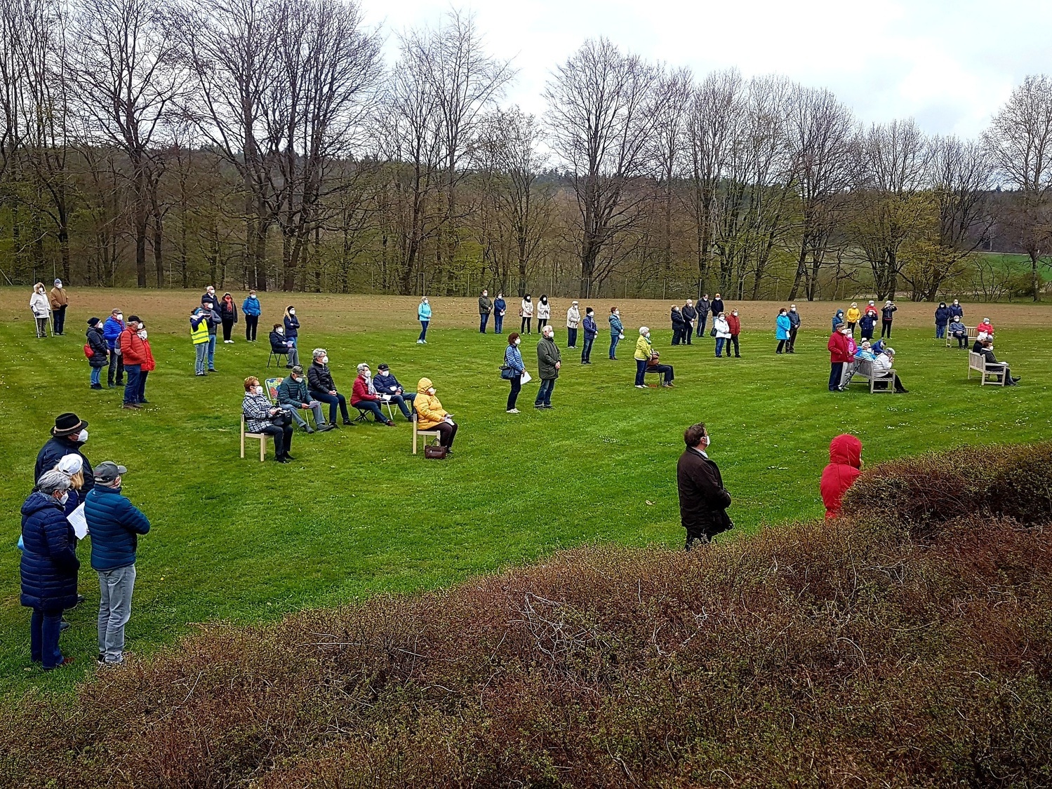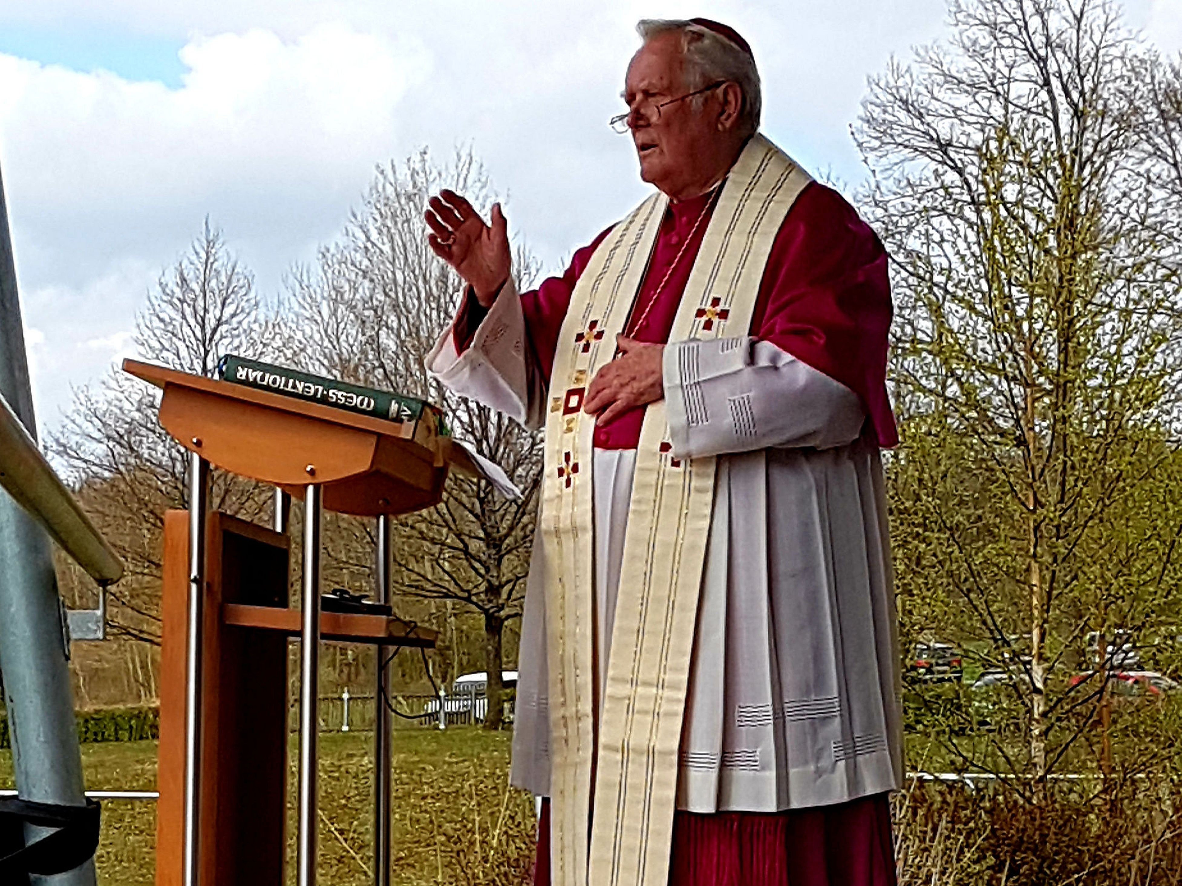 Ursprünglich war für diesen Termin ein Tag der offenen Tür geplant. Dieser konnte aufgrund der Coronapandemie nicht stattfinden. Stattdessen kam Bischof Hofmann zu einer Maiandacht auf den Sportplatz des Volkersbergs. Die rund 100 Teilnehmer hatten dort genügend Platz, sich mit ausreichend Abstand zu versammeln. Die Kuratie Volkers hatte dort eigens einen Marienaltar mit einer vom ehemaligen Volkerser Schulrektor Udal Groß geschnitzten Holzfigur „Regina coeli“ aufgebaut. Bischof Hofmann stellte die Gottesmutter Maria als „große Fürsprecherin bei Gott und Mittlerin zu Christus“ in den Mittelpunkt seiner Predigt. „Wir alle leben in sehr stürmischen Zeiten und sind verunsichert. Da tut es gut, auf die Gottesmutter zu vertrauen.“ Wenn auch das Singen der vertrauten Marienlieder aufgrund der staatlichen Vorgaben nicht möglich war, erfreuten die Leichtersbacher Musikanten mit „Maria Maienkönigin“ oder „Segne du, Maria“ die Herzen der Besucher.