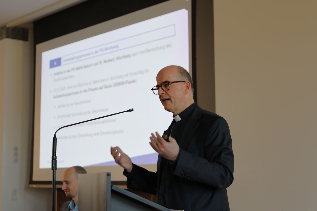 Zum Prozess der Aufarbeitung sexualisierter Gewalt in der Pfarreiengemeinschaft Mariä Geburt und Sankt Norbert Höchberg erklärte der Bischof, dass die erste Phase nun abgeschlossen sei, in der es darum gegangen sei, das Handeln der damaligen Diözesanleitung ab dem Jahr 2010 zu rekonstruieren. Er erklärte, dass mehrere Dinge in Folge der Meldung sexuellen Missbrauchs nicht korrekt gelaufen seien. Es habe unter anderem keine kirchliche Voruntersuchung gegeben, keine schriftliche und somit nachweisbare Meldung nach Rom, keine Entfernung des Geistlichen aus dem Dienst und dem Pfarrhaus sowie keine Information der Gemeinde. „Was noch aussteht ist die Einschätzung des römischen Dikasteriums für die Bischöfe zum Vorgehen des damaligen Ortsbischofs Dr. Friedhelm Hofmann in diesem Zusammenhang in den Jahren zwischen 2010 und 2017“, betonte Bischof Jung. Wichtig sei nun, dass die Gemeinde gut in die Phase zwei der Aufarbeitung eintreten kann, in der es um die Bearbeitung der aufgekommenen Emotionen gehe. Unter anderem wolle man die Person des Gründerpfarrers anhand des Konzepts der „paradoxen Persönlichkeit“ betrachten.