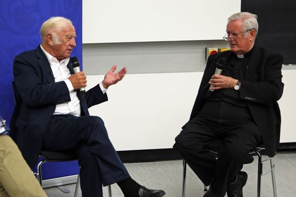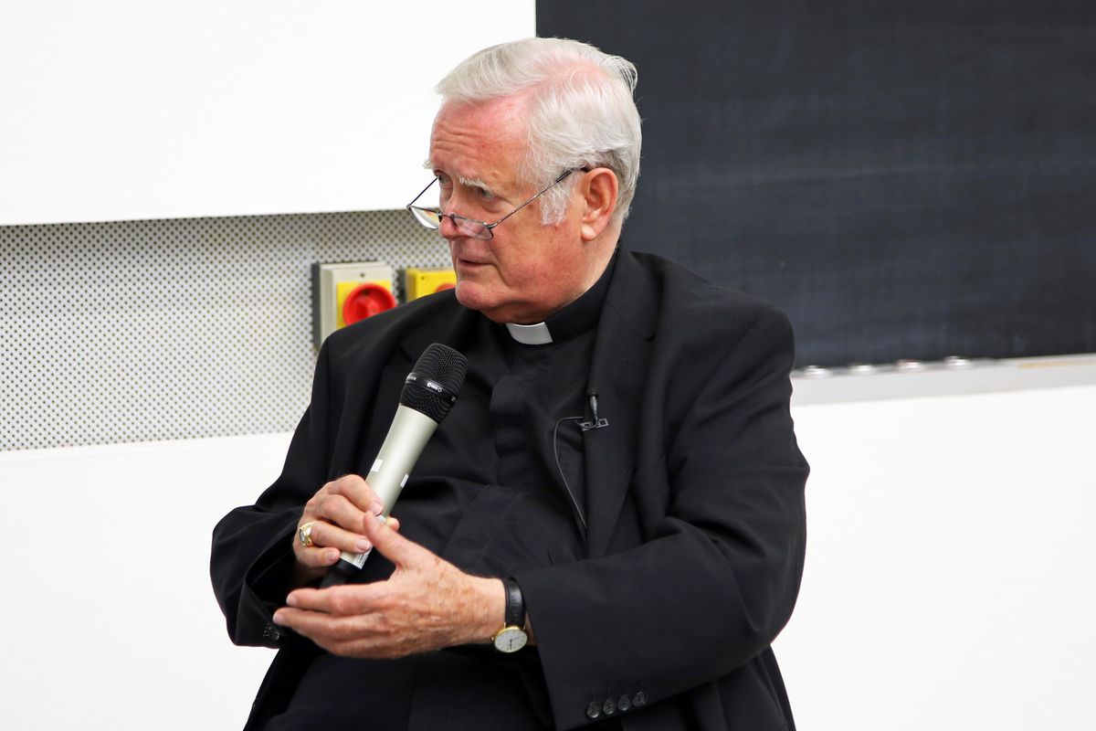 Würzburg (POW) Bei einem ebenso tiefgründigen wie kurzweiligen Künstlergespräch haben sich der promovierte Kunsthistoriker Bischof em. Dr. Friedhelm Hofmann und Professor Heinz Mack, freier Maler und Bildhauer, am Mittwochabend, 5. Juni, über das Thema „Theologie und Kunstgeschichte“ ausgetauscht. Vor rund 70 Interessierten diskutierten sie in der Neuen Universität in Würzburg über den Beginn ihrer Zusammenarbeit, die Definition von Schönheit oder die Gemeinsamkeiten von Kunst und Theologie. Beide verteidigten entschieden die Freiheit der Kunst. „Ich achte sehr darauf, dass ich ein freier Mann bleibe, dass ich mir selbst treu bleibe“, erklärte Mack. „Die Kirche ist gut beraten, die Eigenständigkeit der Kunst wahrzunehmen, keine Schranken zu errichten, sondern das Geheimnis, das in der bildenden Kunst sichtbar wird, anzunehmen“, sagte Bischof Hofmann. „Wir werden die Reihe sicher fortsetzen“, versprach Moderator Professor Dr. Martin Stuflesser, Inhaber des Lehrstuhls für Liturgiewissenschaft, nach dem langanhaltenden Schlussapplaus.