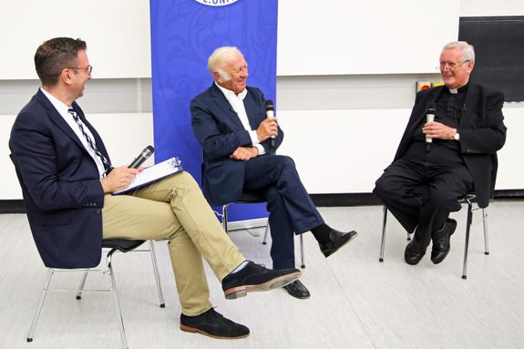 Es habe sich um keine Auftragsarbeit gehandelt, betonte Bischof Hofmann auf eine Frage aus dem Publikum: Der Künstler sei absolut frei von Vorgaben gewesen. Mack selbst beschrieb die Arbeit an der Kapelle als eine Gratwanderung zwischen Gewissheit und Zweifel: „Ich habe mich einem Abenteuer gestellt.“ Umso mehr freue es ihn, dass die Kapelle außerordentlich beliebt sei. Sie sei auch für junge Menschen ein Magnet, bestätigte Bischof Hofmann. Und die Arbeit sei „noch nicht ganz abgeschlossen“, wie Mack erklärte. So wurde die Ausstattung im Jahr 2017 um zwei Altarleuchter und in diesem Jahr um ein dreidimensionales Vortragskreuz ergänzt. Ob sich die Liturgie in einem Kunstwerk anders feiere, wollte Stuflesser wissen. „Es hat schon eine Wirkung auf den, der dort zelebriert“, bestätigte der Bischof: „Es ist nicht einfach nur ein Abspulen des Ritus, sondern man kommt in die Geschichte dahinter.“