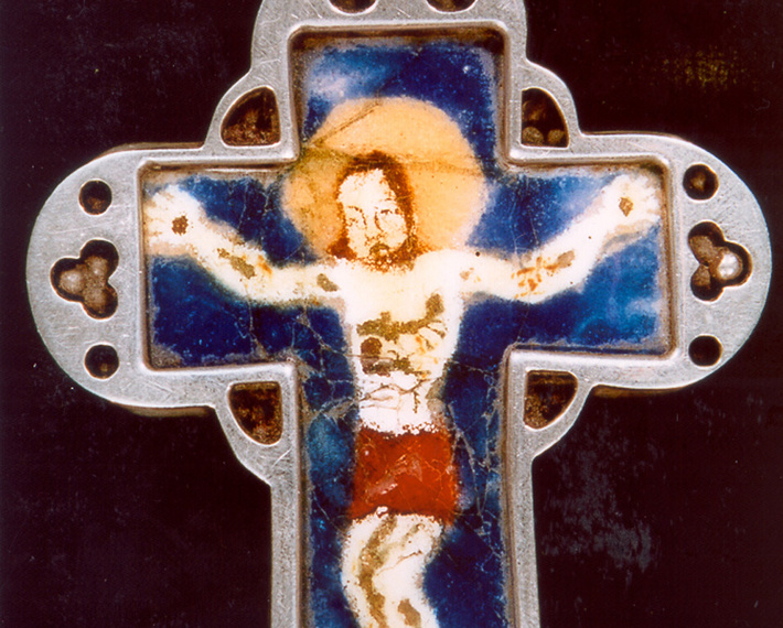 Das Bischofskreuz ist das Kreuz, das Bischof Dr. Friedhelm Hofmann an einer Kette um den Hals auf der Brust trägt. In der Geschichte wurde das Brustkreuz erst viel später als die anderen Insignien Zeichen bischöflicher Würde. Zur Zeit des Barock waren die Brustkreuze oft prunkvoll. Heute geht der Trend unter den Bischöfen wieder zu einfacheren Kreuzen - so auch das des Würzburger Bischofs. Eine bunte Ikonografie zeigt Jesus in der Haltung am Kreuz. Von einer silbernen Fassung ist das Bild umrahmt.